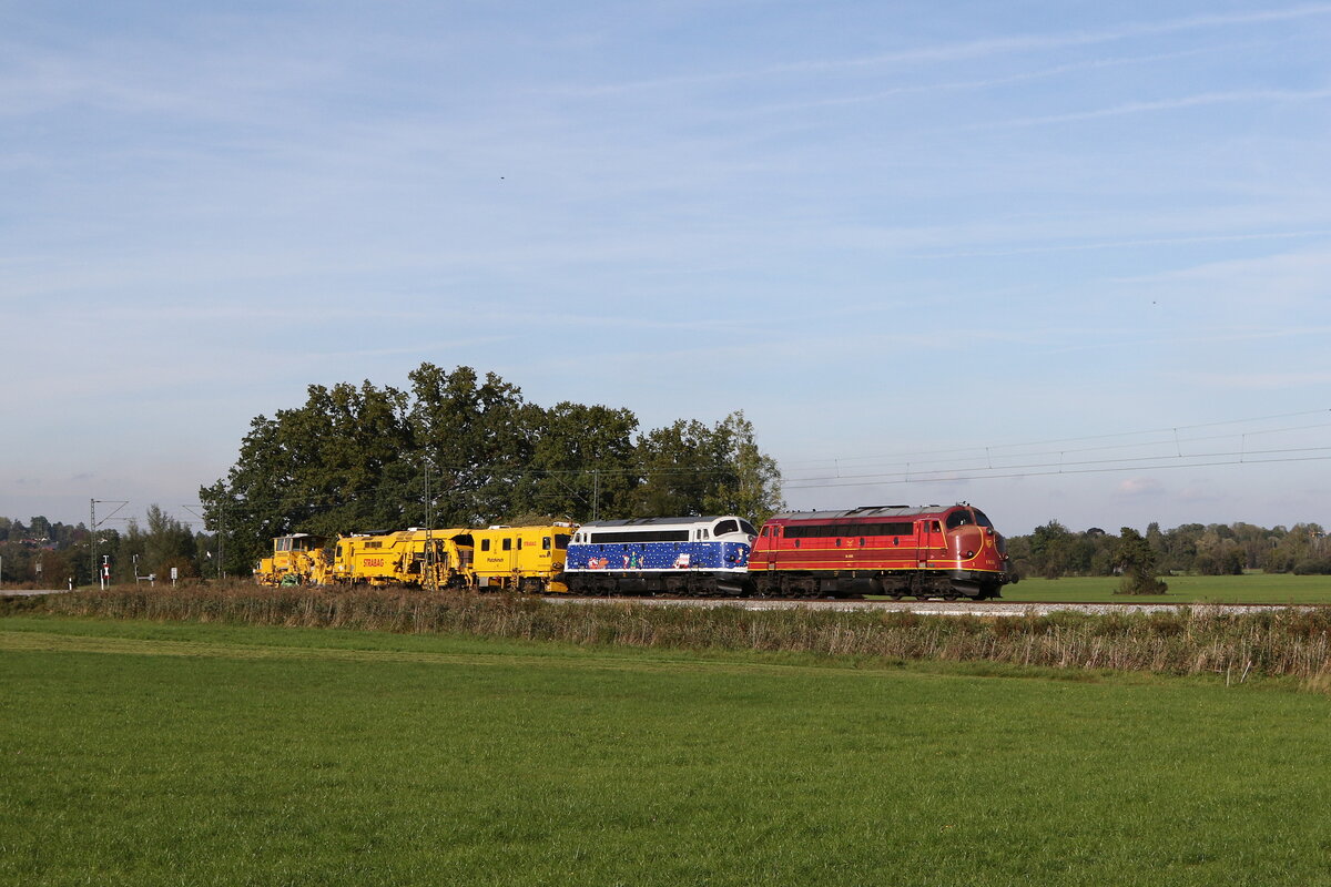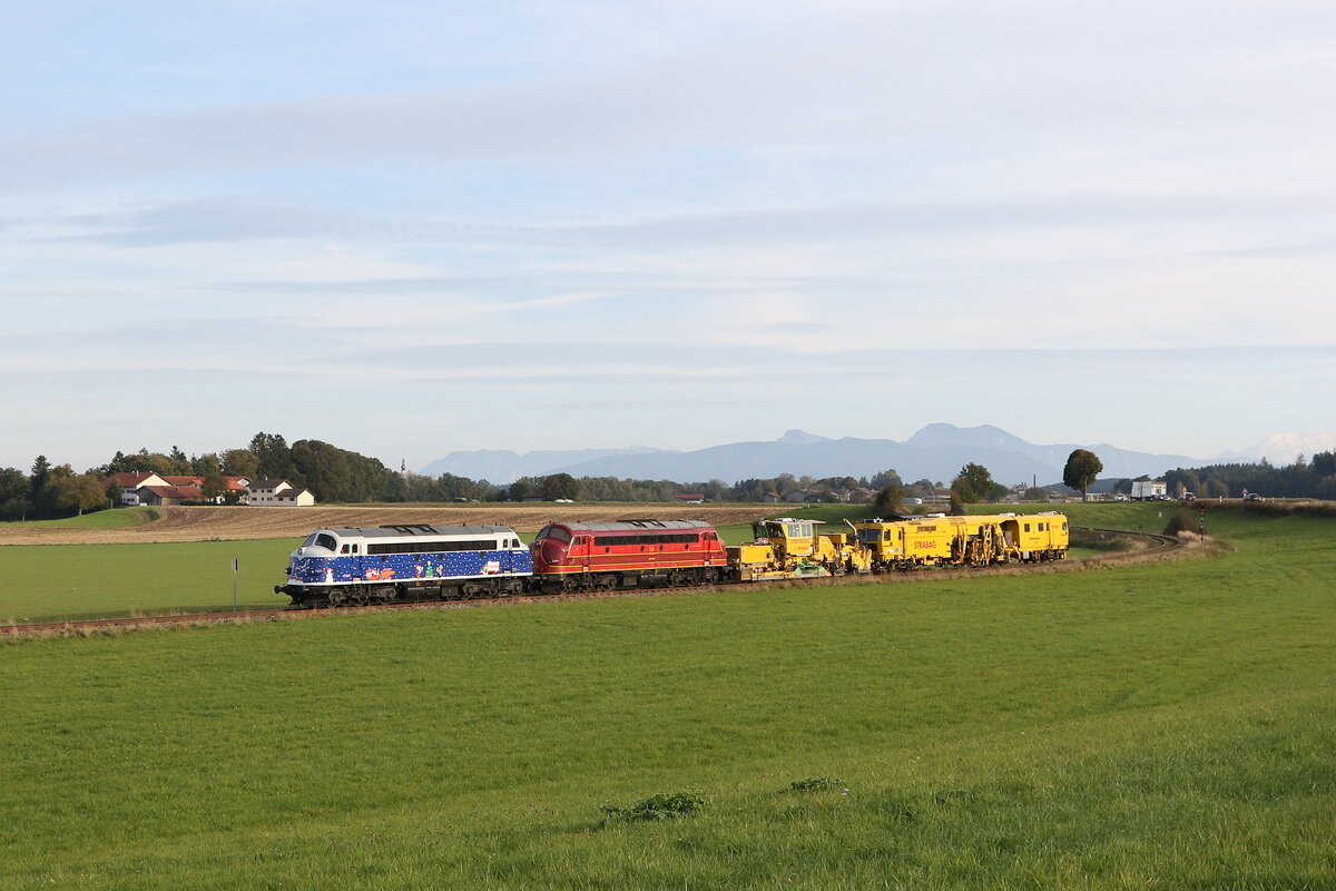Nohab My 1155 (227 010) und My 1149 (227 008)  Isabella  von  Altmark Rail  waren am 11. Oktober 2021 mit einem Bauzug bei Bernau am Chiemsee in Richtung Traunstein unterwegs.