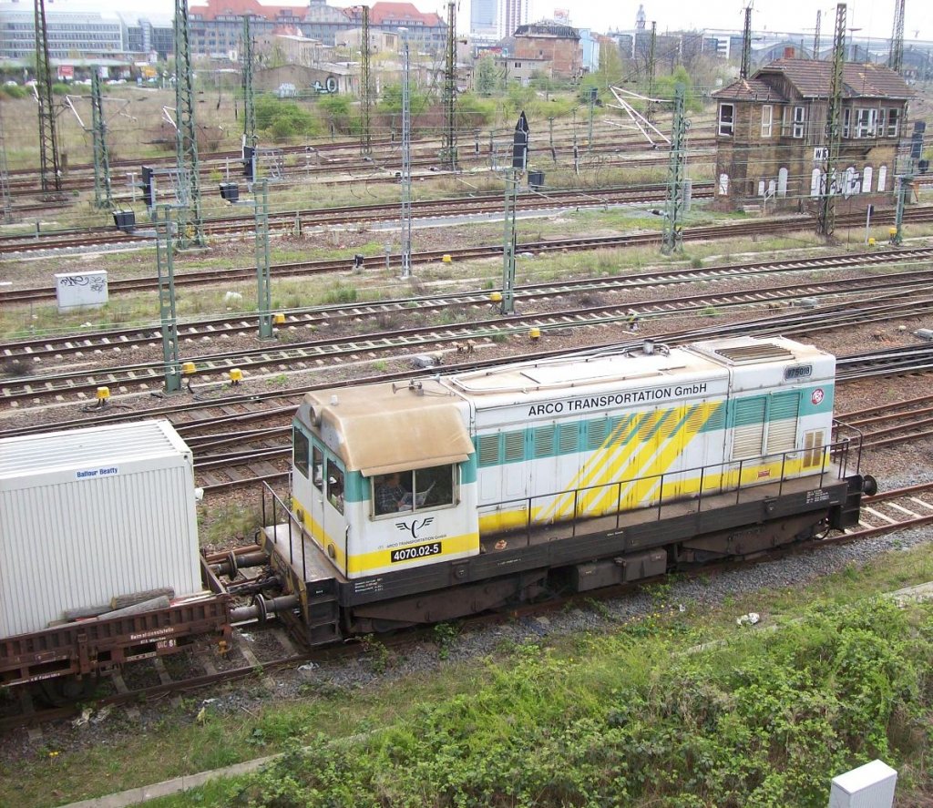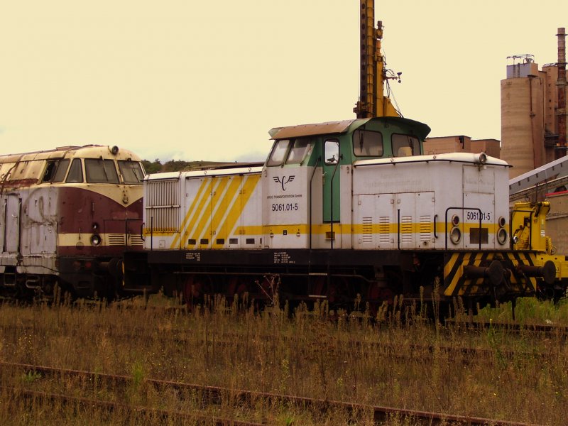 5061.20 der Arco Transportation GmbH steht in Schkeuditz bei Leipzig und S-Bahn (S10) Leipzig - Halle fährt gerde in Richtung Halle 10/2005 Dieter Berger