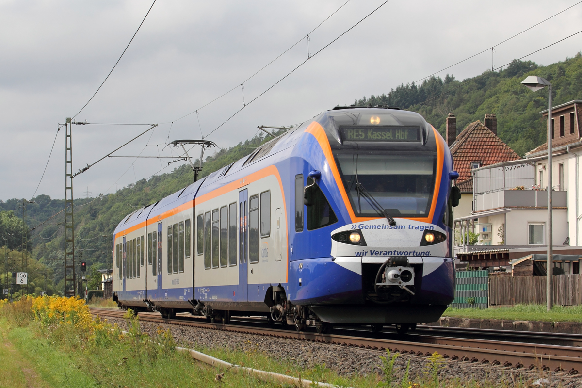 427 052 als R7 nach Göttingen und 427 003 als R7 nach Bebra beim Halt in Wehretal-Reichensachsen. Aufgenommen am 28.08.2015.
