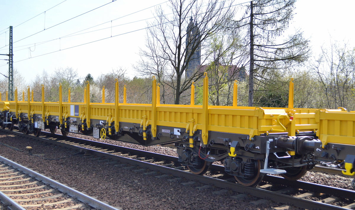 Auslieferung (Überführung) von fabrikneuen Drehgestell-Flachwagen mit Seitenborden vom bulgarischen Hersteller TRANSVAGON-AD aus Burgas für die Fa. Hering Bahnbau GmbH Essen, Standort Burbach, im Bild der Wagen mit der Nr. 37 TEN 80 D-HGUI 3988 017-4 Rens 192B am 02.04.19 Dreasden-Strehlen. Lothar Stöckmann