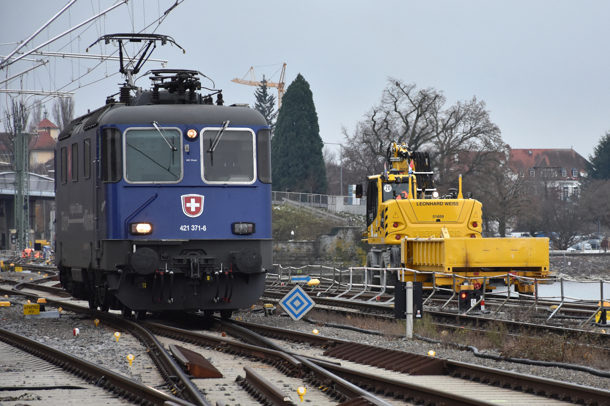 Re 421 371-6 trifft am Bodenseedamm auf einen Liebherr Litronic 922 Rail Zweiwegebagger der Fa. Leonhard Weiss.