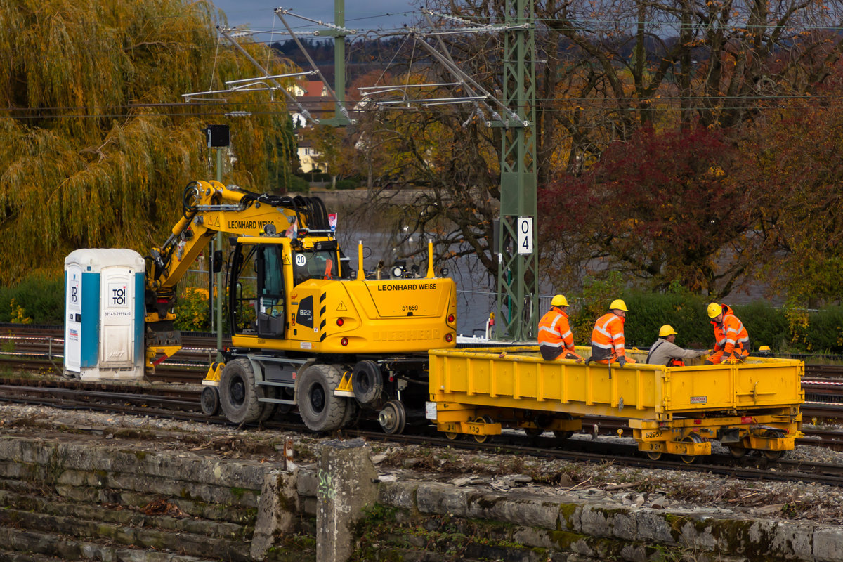 Bei Gleisbauarbeiten auf den Bahnstrecken rund um Neuenmarkt-Wirsberg im Oktober und November kam u. a. die Dualmode-Lokomotive 248 040 (ATLU) der Firma Leonard Weiss am 01.11.2024 mit einem Schienenumbauzug zum Einsatz.