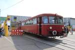 Nachschuss auf die Zwei-Schwellen-Stopfmaschine Plasser & Theurer 09-2XY Dynamic  Frankenexpress  mit dem Städtenamen  Crailsheim  (588508 | 99 80 9121 016-6 D-EVULW) und eine Schotterplanier- und Profilierungsmaschine Plasser & Theurer SSP 110 SW  Frankenexpress  (88510 | 99 80 9425 045-8 D-EVULW), gezogen von 203 231-6 (L.W.203.001 | 202 390-1 | 112 390-0 | 110 390-2 | DR V 100.1) in Halle-Ammendorf, Eisenbahnstraße, Richtung Abzweig Halle Thüringer Bahn.