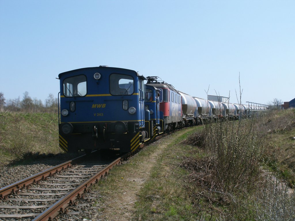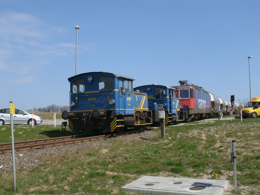 MWB-V243,V244 und die SBB-Cargo Re421 396 unterwegs am 20.April 2011 auf dem Anschlußgleis in Mukran.