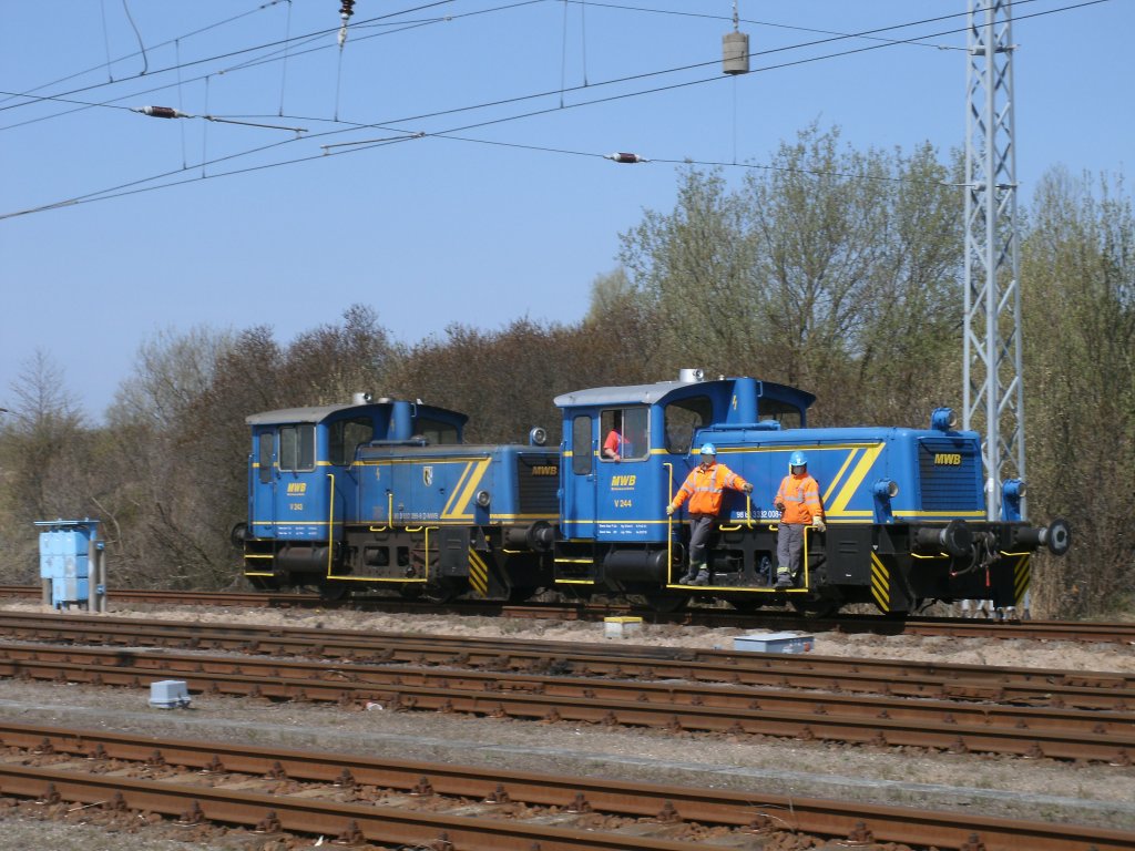 Von der Straßenbrücke in Mukran aus fotografierte ich,am 20.April 2011, die beiden MWB V243 und V244 als Sie auf dem Anschlußgleis zum Betonummandlungswerk unterwegs waren.