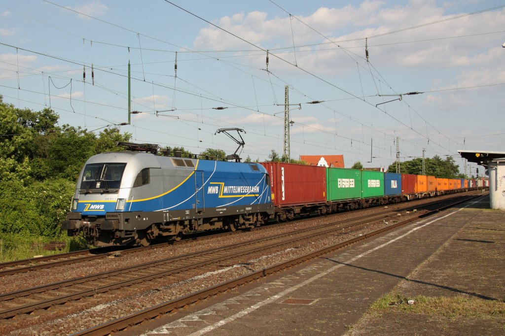 Endlich haben wir sie auch! So oft vorbeigefahren, aber am frühen Morgen des 27.05.2010 hat's geklappt. 182 911-8 / 1116 911-7 der MWB mit Containerzug in Fahrtrichtung Norden durch Eschwege West.