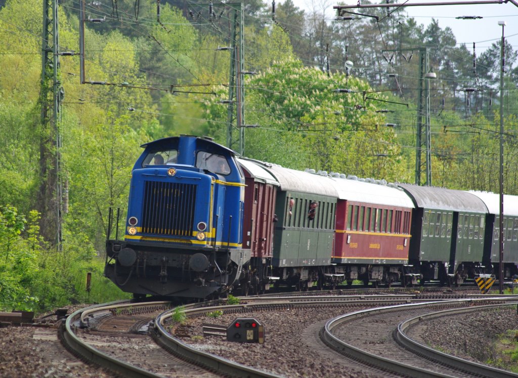 Einen Sonderzug konnten wir am 13.05.2010 sehen. Gezogen wurde dieser von V1354 der MWB (ex DB BR 213). Die Fahrt ging von Lemgo nach Ilmenau. Hier erklimmt sie gerade die Cornberger Höhe. Leider hat die Kamera zu diesem Zeitpunkt etwas versagt und man sieht nichts von den Wagen, aber dafür gibt's später noch ein Bild der Rückfahrt wo man auch den Zug als solches erkennen kann.
