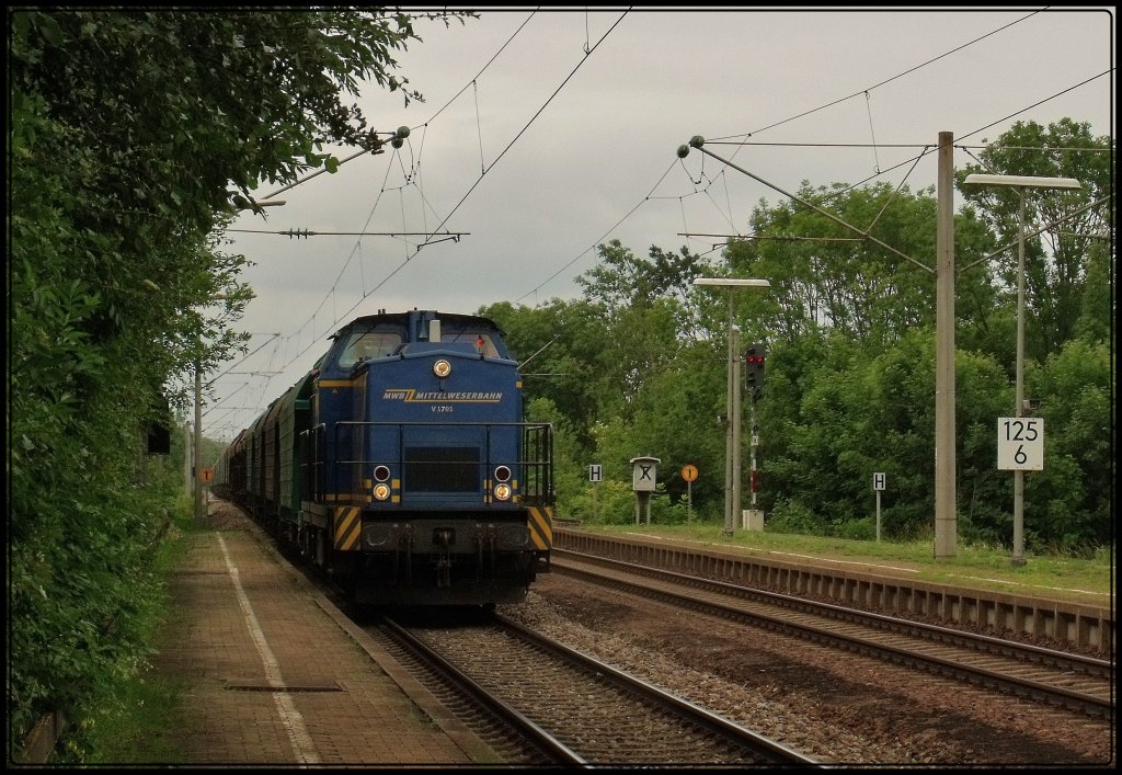 V 1701(ex.DB BR 203) der Mittelweserbahn fuhr am 20.06.2010 mit einem Getreide-bedarfszug gen Landshut. Hier zu sehen in Köfering.