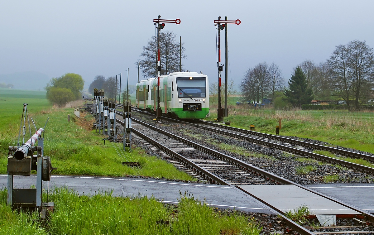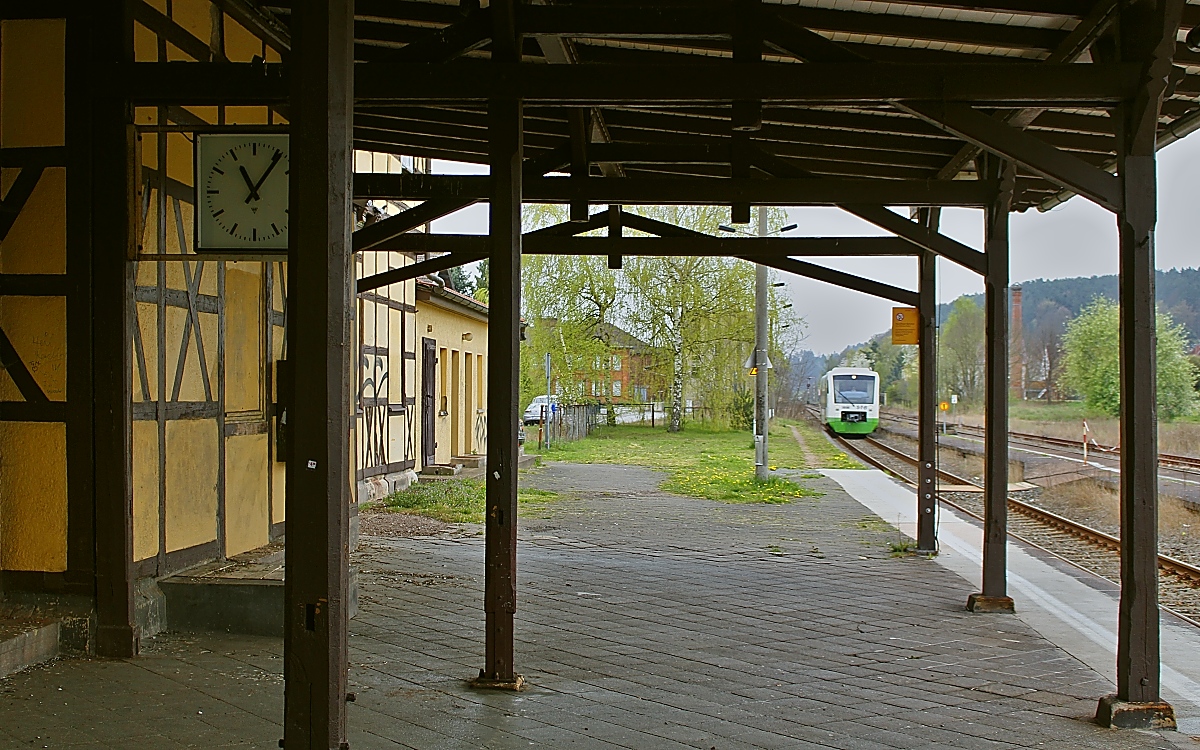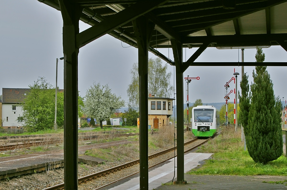 Als der VT 118 der Süd-Thüringen-Bahn am 11.04.2014 auf dem Weg nach Meiningen in den Bahnhof Immelborn einfährt, erinnerte die Infrastruktur mit Stellwerk, Formsignalen und Bahnhofslampen noch stark an die Reichsbahn. Bis zur Stilllegung der Strecke nach Bad Liebenstein war Immelborn ein Keilbahnhof. Von dieser Strecke ist nur noch ein mehrere hundert Meter langes Anschlußgleis zu einem Kieswerk übrig geblieben (s. Schranken am rechten Bildrand). Bei Bedienung des Werkes wird die Zufahrt zum Bahnhof durch die zwischen Signal und Lampe sichtbare Schranke abgesperrt. Letztes Jahr wurde der Bahnhof modernisiert, im Zuge des Umbaus verschwanden leider auch die Formsignale.