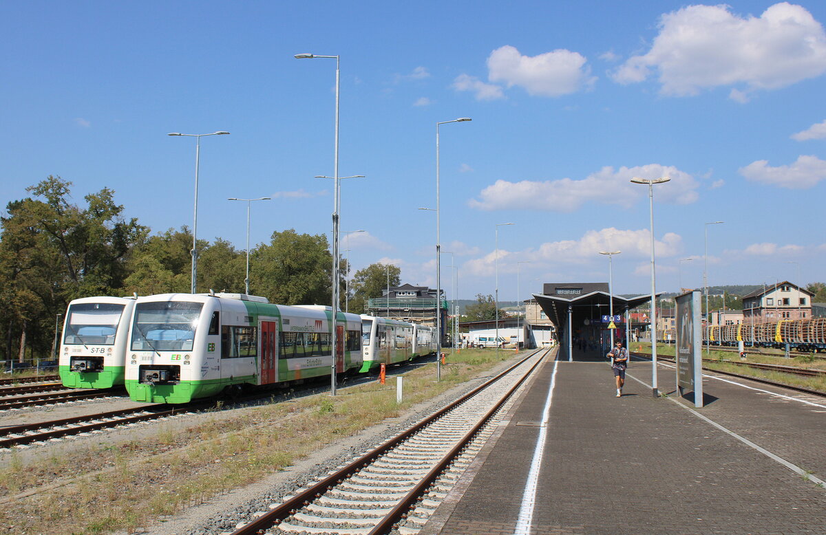 STB 650 528-2 steht im Bahnhof Lauscha(Thür) zur Fahrt von Neuhaus am Rennweg nach Sonneberg(Thür)Hbf. (01.10.2023)