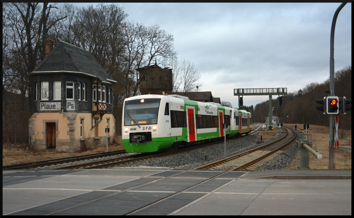 Das Regioshuttle-Doppel der Süd-Thüringen-Bahn Erfurt - Ilmenau beschleunigt am 03.02.2024 nach kurzem Halt in Plaue aus dem Bahnhof.