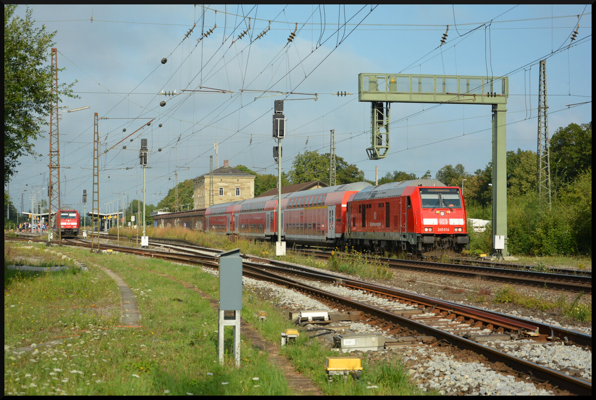 BR Radltour 2024: Für die diesjährige Radltour des Bayerischen Rundfunks, kurz BR Radltour, verkehrten insgesamt fünf Sonderzüge der DB Regio Südostbayernbahn (SOB). Der Sonderzug Nr. 3 (Neustadt/Aisch - Mühldorf) beschleunigt am 03.08.2024 pünktlich von Gleis 1 aus dem Bahnhof Neustadt/Aisch heraus in Richtung Südostbayern. Bespannt war der Zug mit DB Regio SOB Diesellok 245 014 und bestand aus drei Doppelstock- und sechs Schiebewandwagen für den Fahrradtransport.