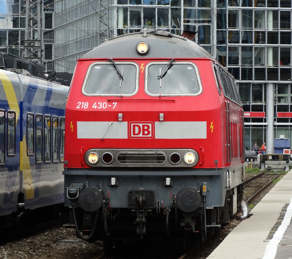 Am 28.9.13 stand die 218 387, welche nach Kempten ausgeliehen ist, im Karlsruher Hauptbahnhof abgestellt. Zuvor kam die Lok über die Rheinbahn angerollt. Seegurke