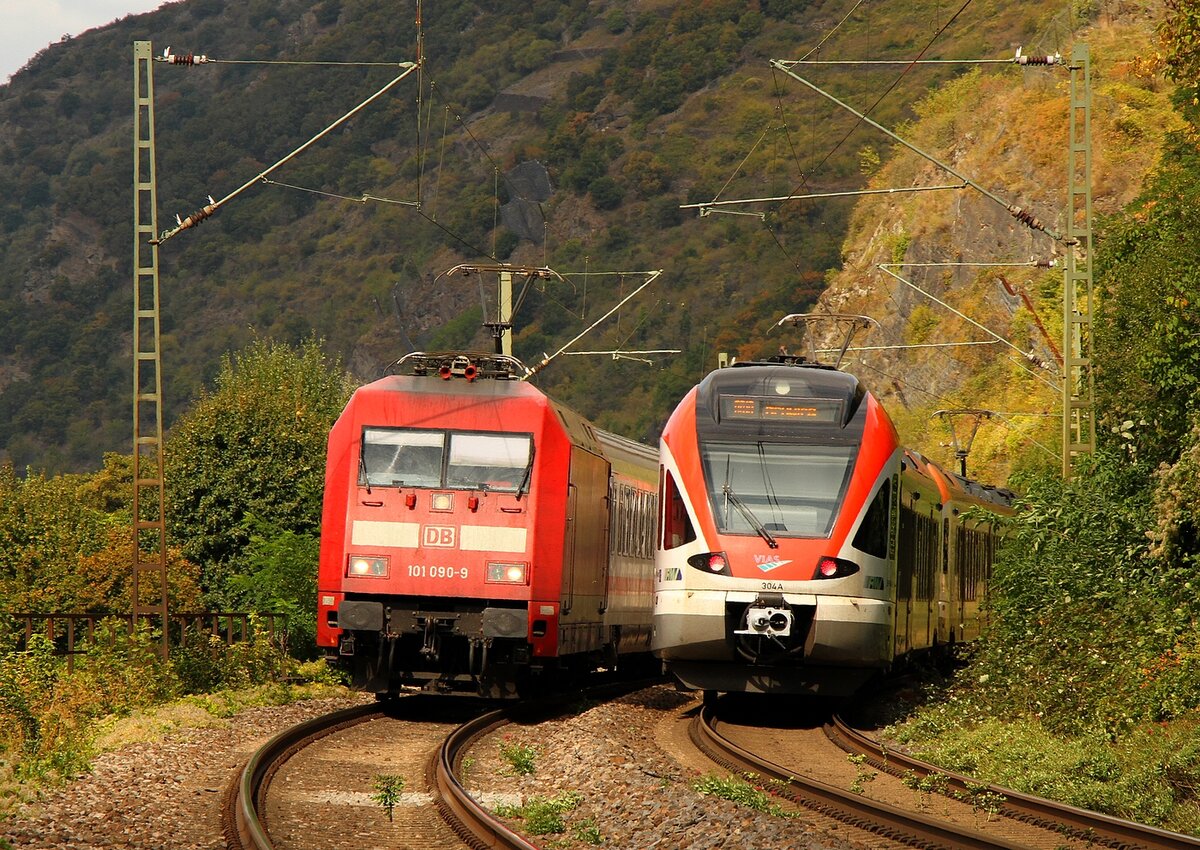 Begegnung zwischen einem IC, der wegen Bauarbeiten auf der Linken auf der rechten Rheinseite unterwegs ist und einem Regionalzug der Vias nahe Kaub/Rhein auf der rechten Rheinseite am 12.09.2021 Joachim Görg