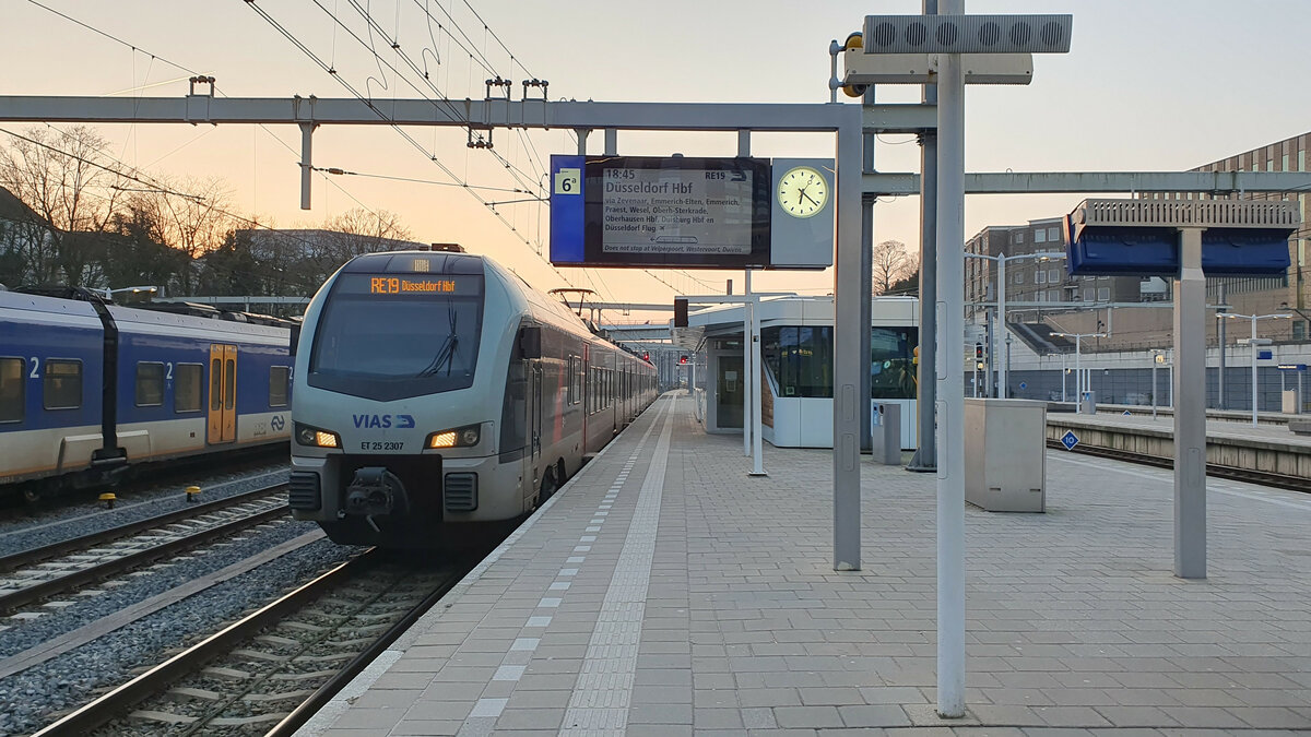 ET 25 2307 im Dienste der VIAS fährt als RE19 von Arnhem Centraal(NL) nach Düsseldorf Hbf und steht hier am Startbahnhof Arnhem Centraal während im Hintergrund die Sonne untergeht.