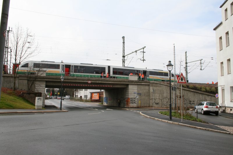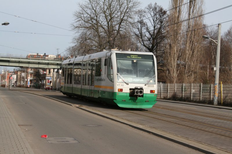 VT 42 zwischen Zwickau Zentrum und Haltepunkt Stadthalle.Bis Stadthalle teilt sich die VBG ein Dreischienengleis mit der Strassenbahn.