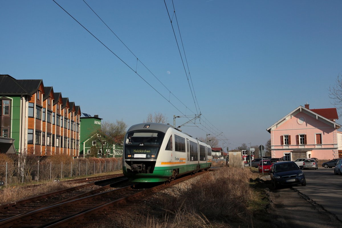 VBG VT08 während seines Einsatzes beim Meridian, damals noch als Vogtland-Express beschriftet, bei Ausfahrt als M32932 aus dem Bf Bruckmühl. 12.03.2014
