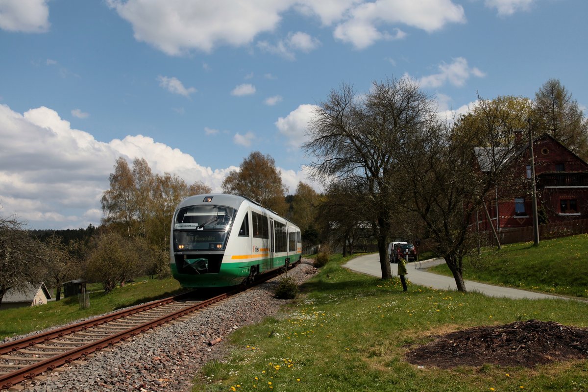 Zu Christi Himmelfahrt kamen nochmals Vogtlandbahnen auf der Strecke zwischen Adorf/Vogtl. und Zwotental zum Einsatz. Hier durchfährt der mit Trilex beschriftete VT10 Gunzen auf der Fahrt nach Adorf. 05.05.2016
