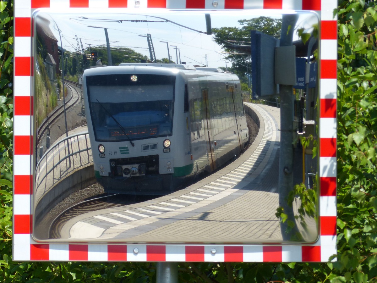 Kurz vor der Endstation Zentrum verlässt die VL 1 das Richtungsgleis, um in das Stumpfgleis der Endstelle einzufahren (Im Bild: VT 36, 9.7.14). Hermann-Josef Weirich