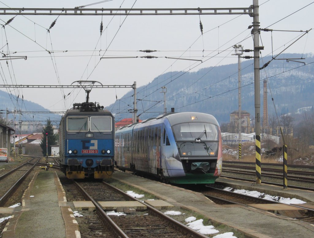 ALEX / VBG 223 066 vor ALX 354 Prag - München, KBS 875 Furth im Wald - Schwandorf, fotografiert bei der Durchfahrt Bhf. Roding am 04.03.2013 --> hinten wartet VT 31 der Oberpfalzbahn als RB 32941 Schwandorf - Furth i. Wald die Kreuzung ab Frank Grohe