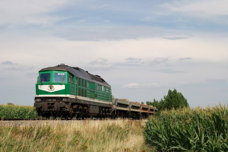 Am Morgen des sonnigen 1. August 2007 fährt V300 005 mit dem Leerzug 66233 durch Hartha in Richtung Sandverladestelle Kayna.