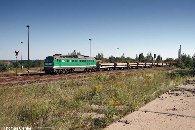 V300 003 fährt mit dem Sandzug 66232 am Morgen des 04.08.07 in den Bf Schmirchau ein, einst Dreh- und Angelpunkt des Wismut-Bahnbetriebes.