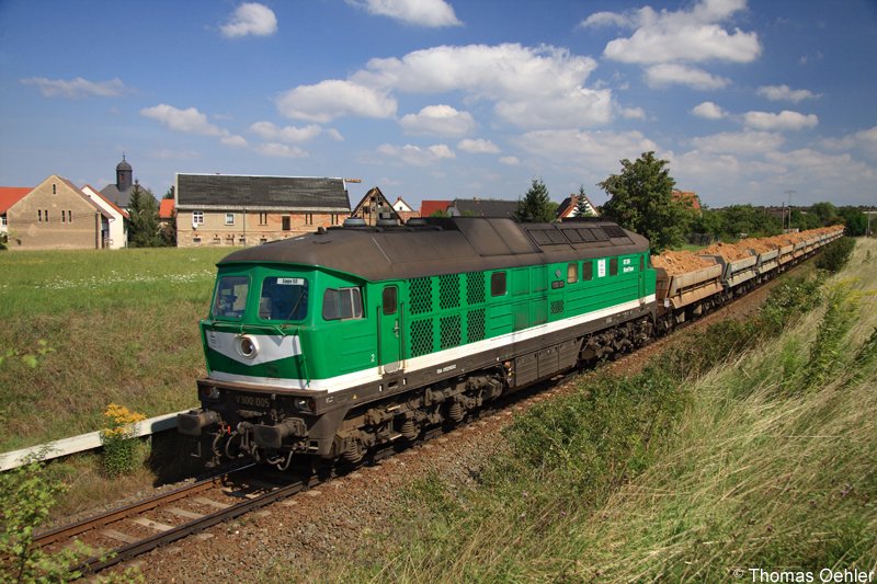 V300 002 ist hier am 04.08.07 mit dem vollbeladenen Sandzug 66236 bei Baldenhain unterwegs.