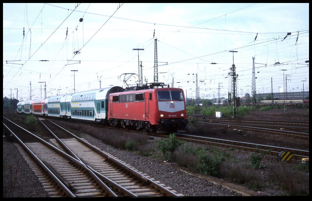 Weil das rechte Gleis erkennbar gesperrt war, kam 143341 am 4.5.1995 linksfahrend mit dem Dosto nach Dresden um 16.03 Uhr durch Kurort Rathen. Gerd Hahn