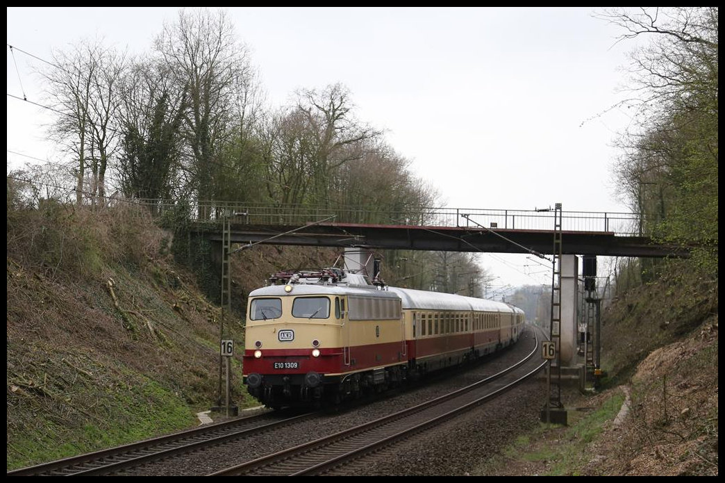Am 31.3.2019 war der AKE Rheingold von Koblenz nach Hamburg Altona unterwegs. Um 9.26 Uhr erreichte er mit Zuglok E 10 1309 den Ortsrand von Hasbergen. Gerd Hahn