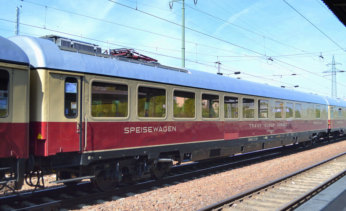 Der TRANS EUROP EXPRESS Speisewagen des AKE Rheingold mit der Nr. D-AKE 56 80 88-94 306-9 WRmz 135.0 mit dem typisch eigenen Stromsystem (Pantograph) am 30.04.19 Bf. Flughafen Berlin-Schönefeld. Lothar Stöckmann