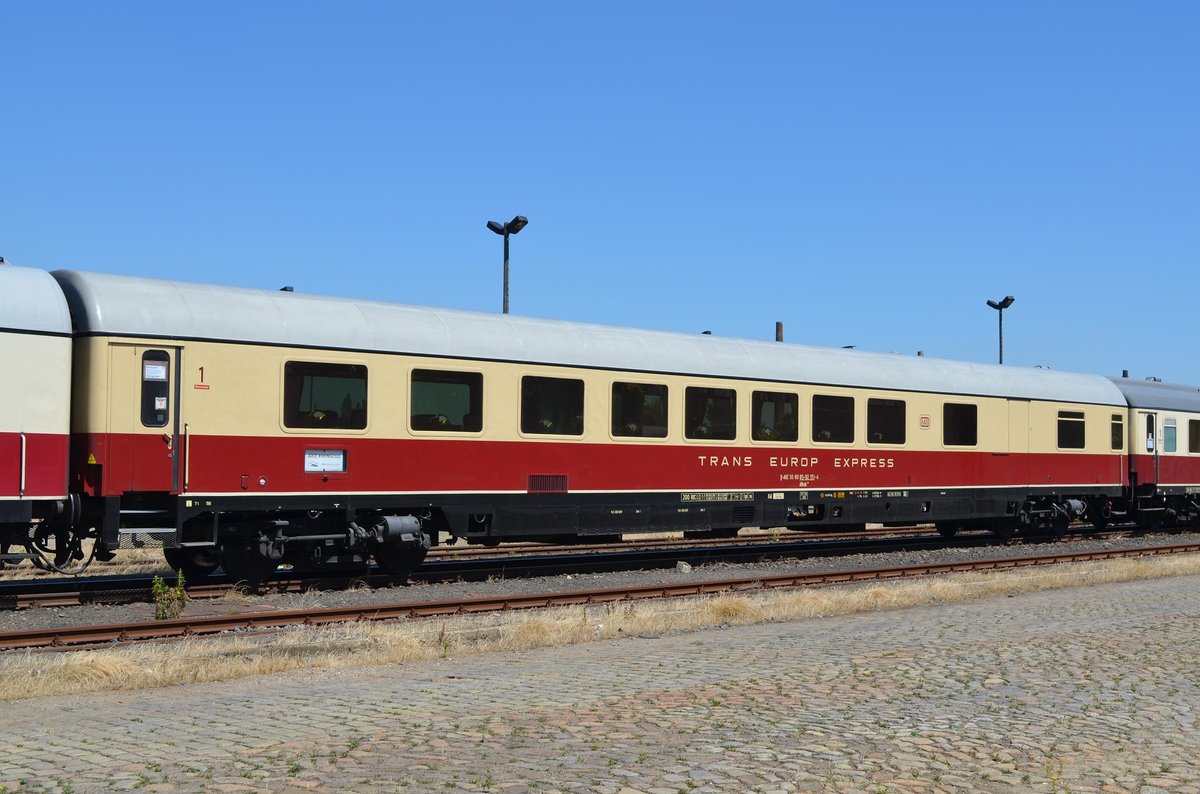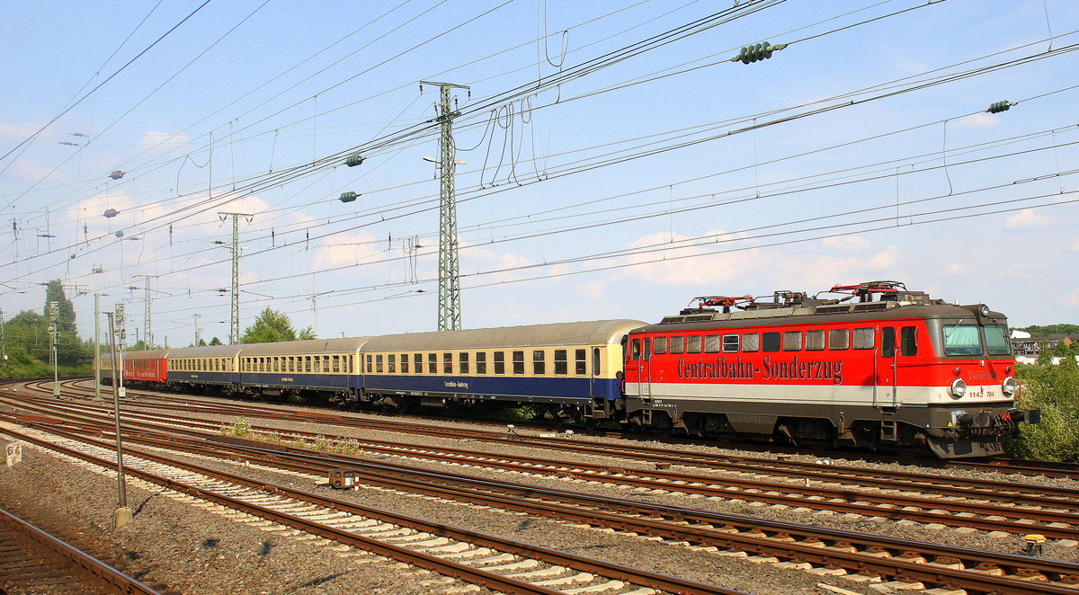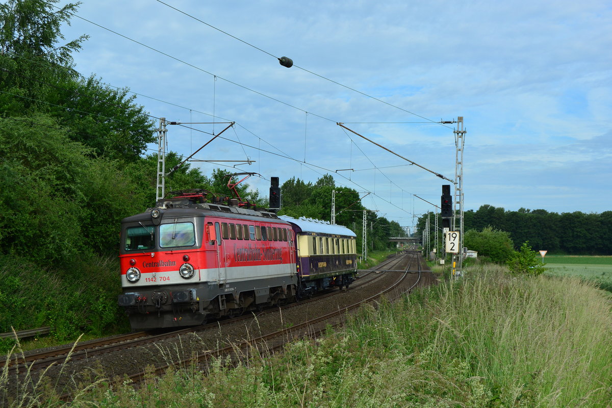 1142 704 zog am 11.6.17 den 1928er Rheingold Speisewagen durch Rommerskirchen Richtung Köln. Sie hatte die Aufgabe den Rheingold Sonderzug als Gourmetfahrt den Rhein entlang zu ziehen.