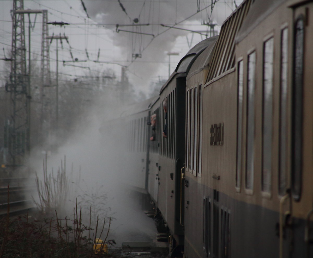Bei der Ausfahrt aus dem Duisburger Hbf machte 01 150 ordentlich dampf. Hinter den ehemaligen Wagen der SBB liefen die berühmten Rheingoldwagen mit, hier ist der "Dome-Car" zu sehen.