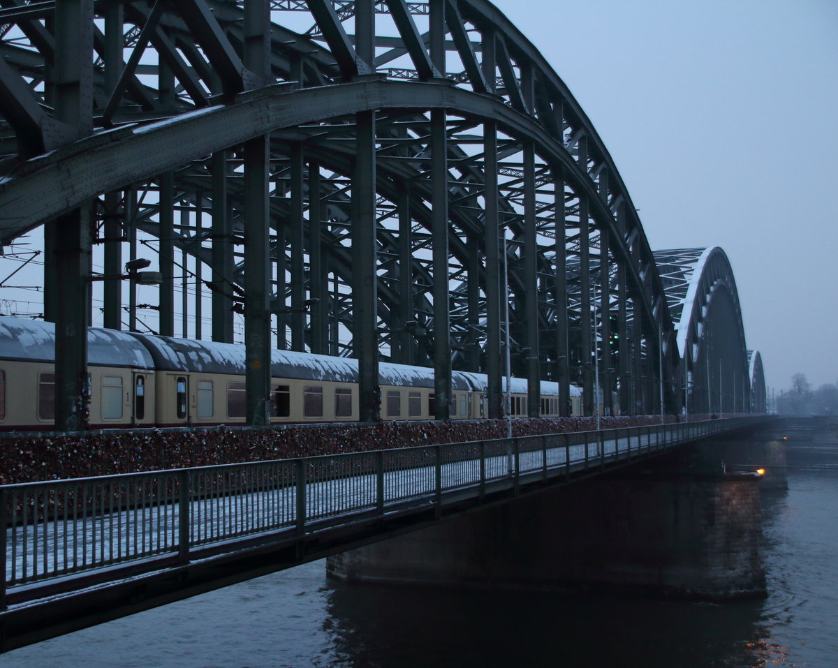 Während in Norddeutschland wegen Unwetter alles still steht, genießen die Reisenden des AKE Rheingold Leipzig - Dortmund den Sonnenuntergang in Köln.