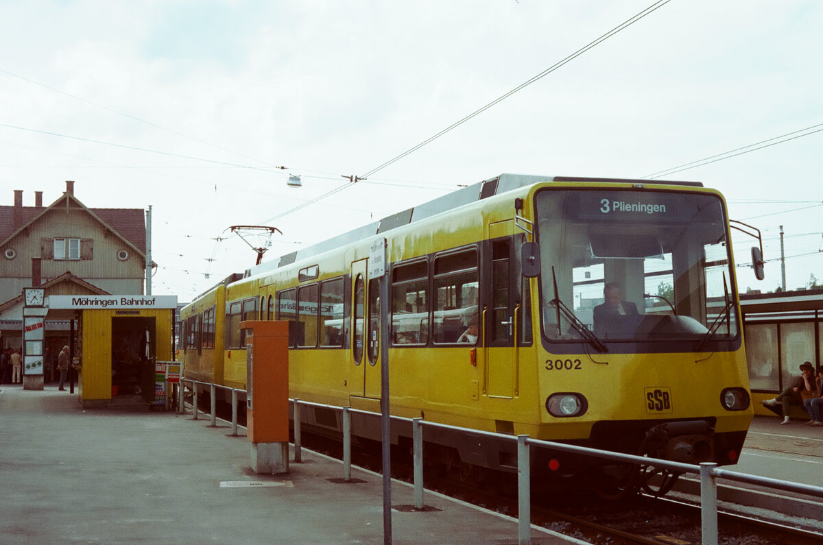 TW 3002 war einer der Stadtbahnwagen-Prototypen (Serie DT 8.1-3) in Stuttgart. Er wurde auf der Straßenbahnlinie 3 zwischen Möhringen und Plieningen zunächst im Wechsel mit Straßenbahnzügen eingesetzt. Er befand sich hier vor dem früheren Bahnhof der Filderbahn in Möhringen.