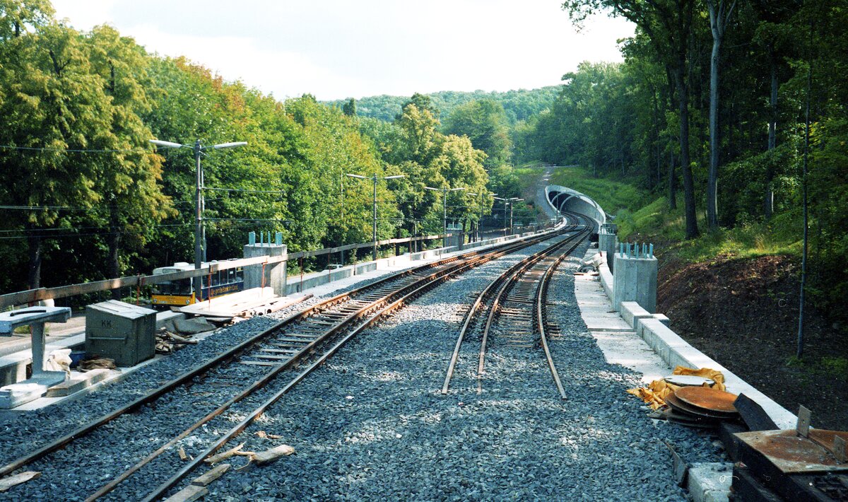 SSB Stuttgart__Von der Straßenbahn zur Stadtbahn__Die (Tunnel-)Strecke nach Degerloch.__Ohne Oberleitung geht halt nix. Aber auch der Gleisbau ist längst noch nicht vollendet. Die (vorübergehend) 4-gleisige, lange Gerade. An deren Ende, beim Denkmal für den Erbauer der Neuen Weinsteige <1826-31>, Gottlieb Christian Eberhard von Etzel, geht es links zur Haltestelle 'Waldau' (später 'Weinsteige').__30-08-1986 Klaus-Erich Lisk