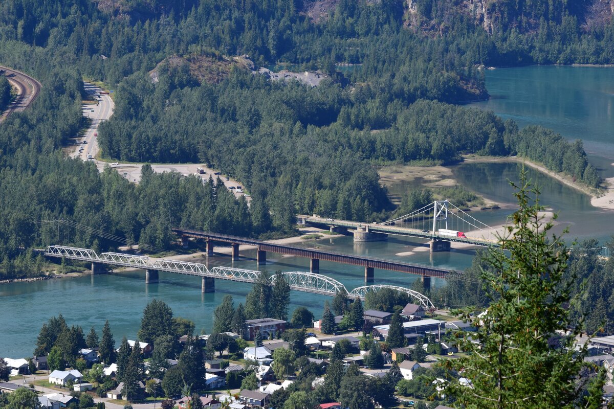 Am 29.8.22 ging es hoch auf den Mount Revelstoke. Schon auf dem Weg hinauf boten sich tolle Ausblicke. Vom Monashee Lookoutbot sich ein toller Blick auf die 3 Brücken über den Columbia River. Vorne sieht man die nur einspurige Big Eddy Bridge, in der Mitte die Eisenbahnbrücke der CP Railway und im Hintergrund befindet sich die Hängebrücke des Highway One.