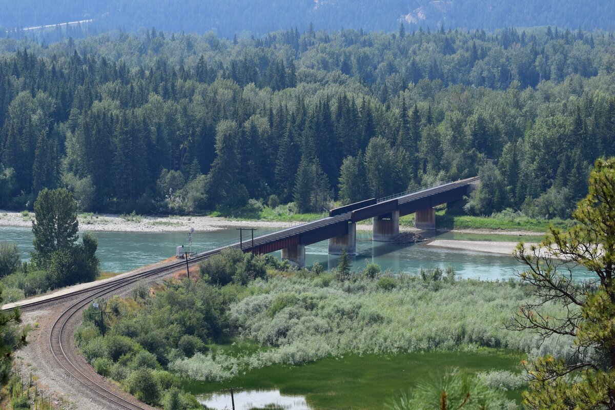 Blick auf die bei Fort Steele abzweigende Strecke nach Cranbrook. Hier überquert sie den Kootenay River. Fort Steele 16.08.2022