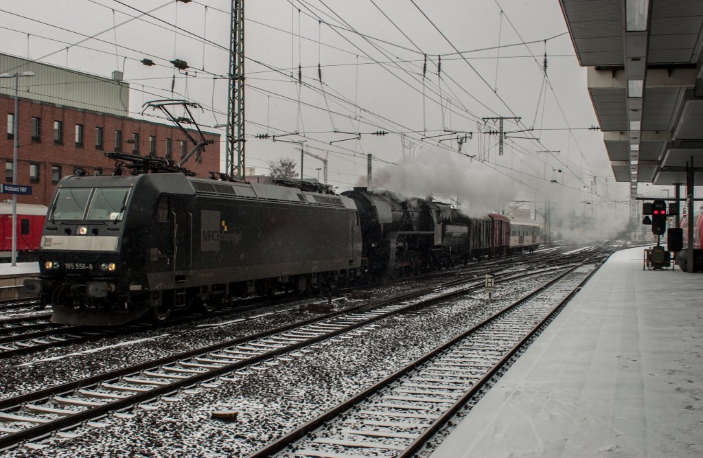 185 556 mit dem 5519-Überführungszuge am 23.02.13 in Koblenz HBF.