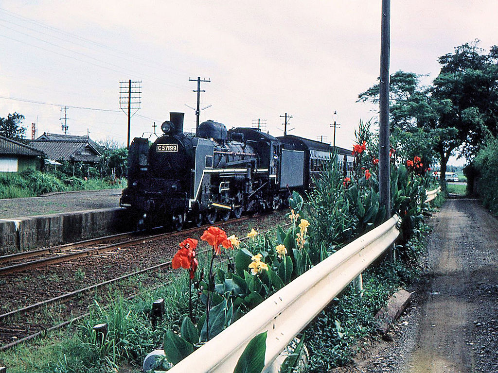 Japanische Dampflokomotiven C57 auf der Südinsel Kyûshû: Nördlich der Stadt Miyazaki bringt Lok C57 199 ihren Lokalzug in die Station Hyûga Sumiyoshi. 14.August 1972 Peter Ackermann
