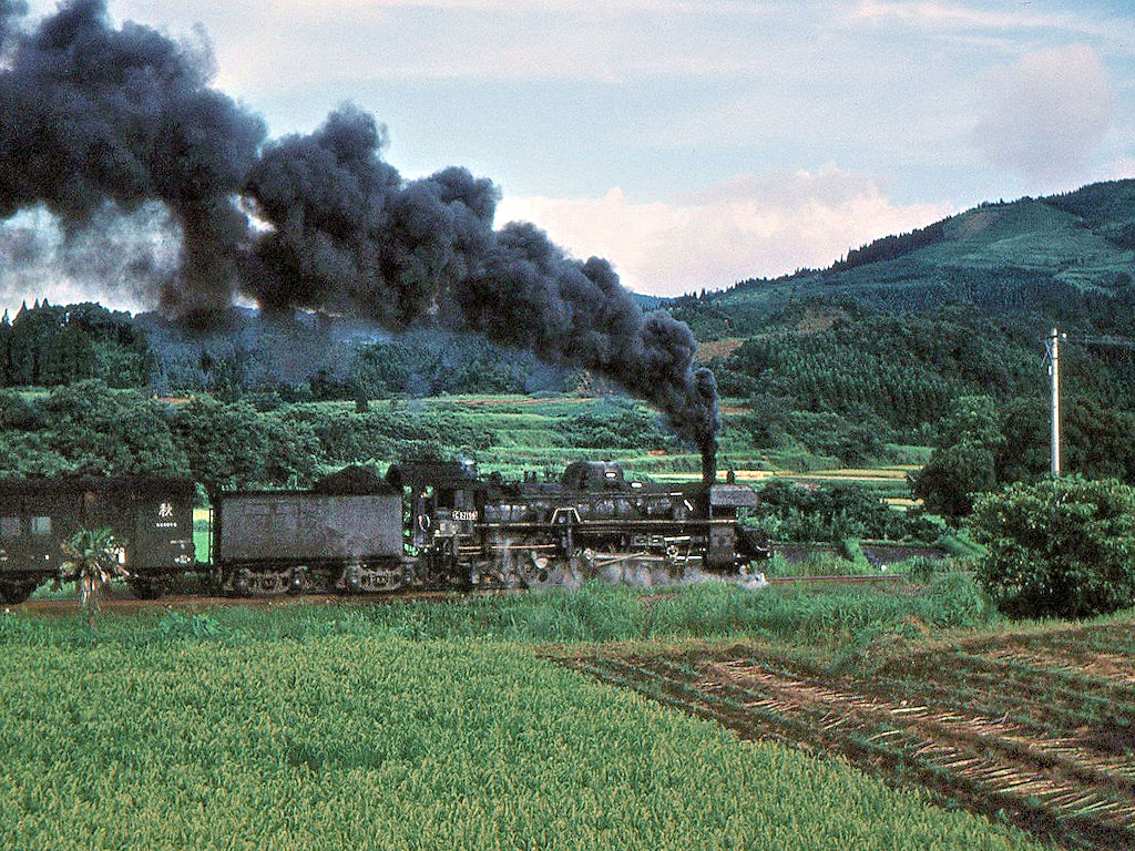 Japanische Dampflokomotiven C57 auf der Südinsel Kyûshû: C57 196 mit einem Güterzug im Aufstieg nach Miyakonojô; heute ist der Güterverkehr hier längst auf der Strasse. Hyûga Kutsukake, 13.August 1972 Peter Ackermann