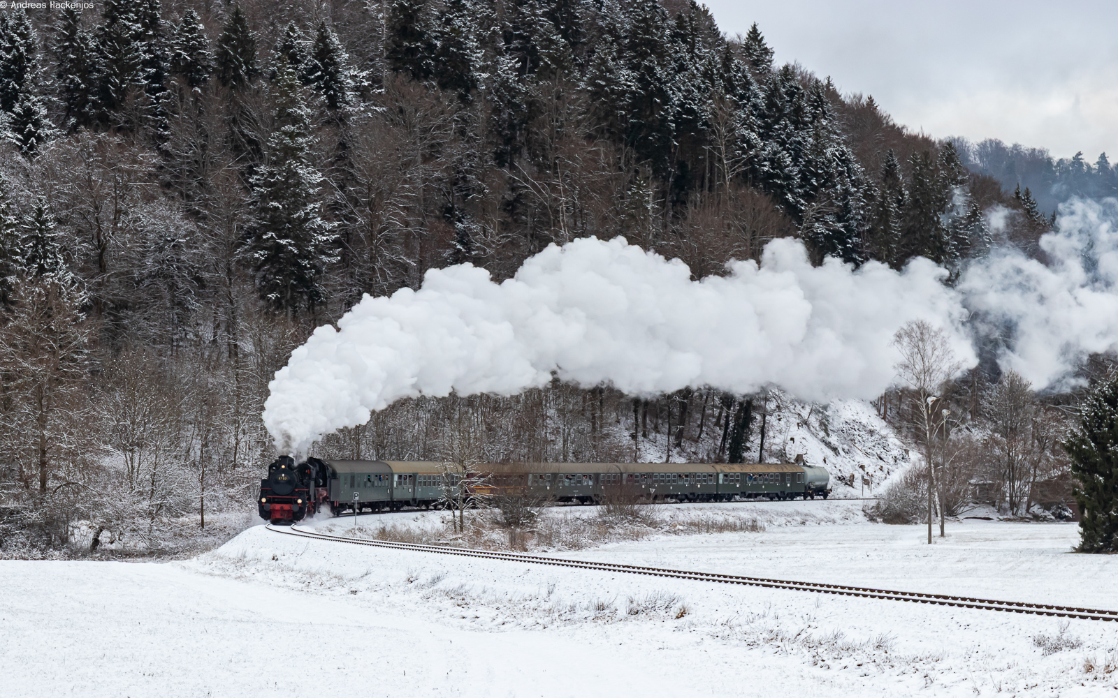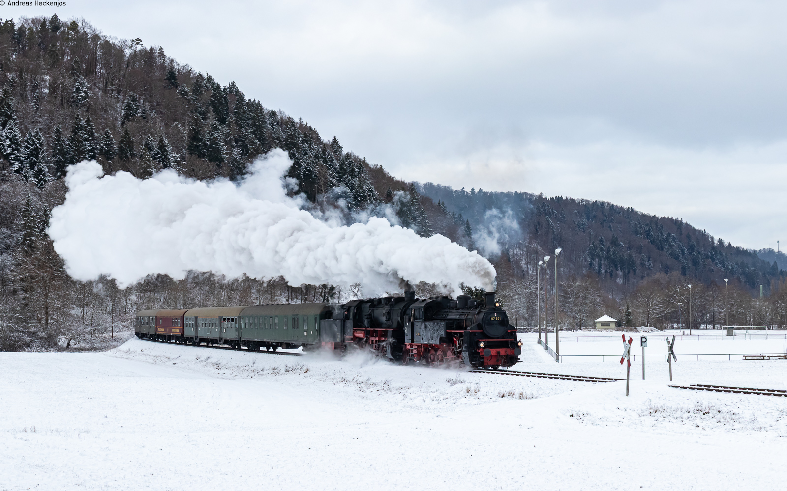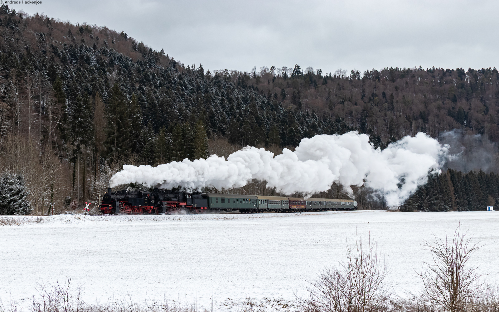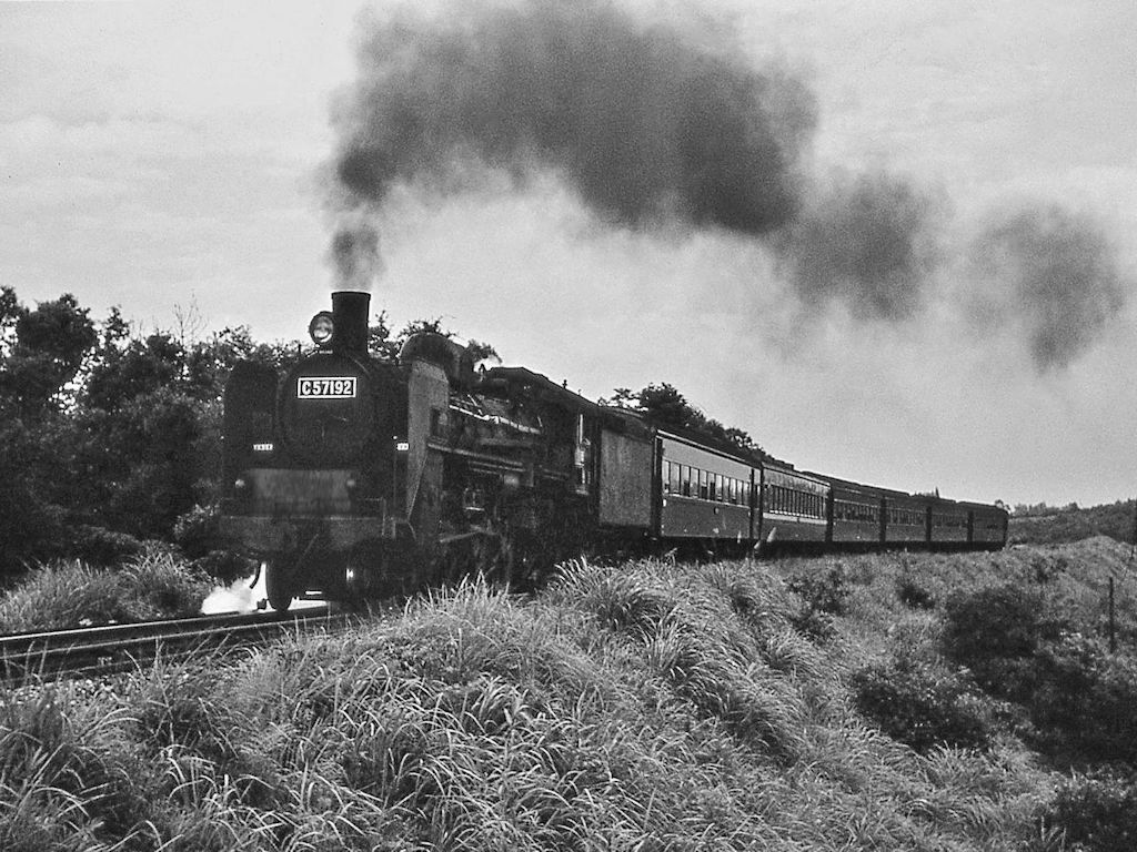 Japanische Dampflokomotiven C57 auf der Südinsel Kyûshû: Lok C57 192 muss kräftig arbeiten, um ihren Schnellzug von Miyazaki über den Pass nach Kagoshima hinüberzubringen. Der Zug führt sogar noch einen Erstklasswagen mit. Bei Tano, 12.August 1972 Peter Ackermann