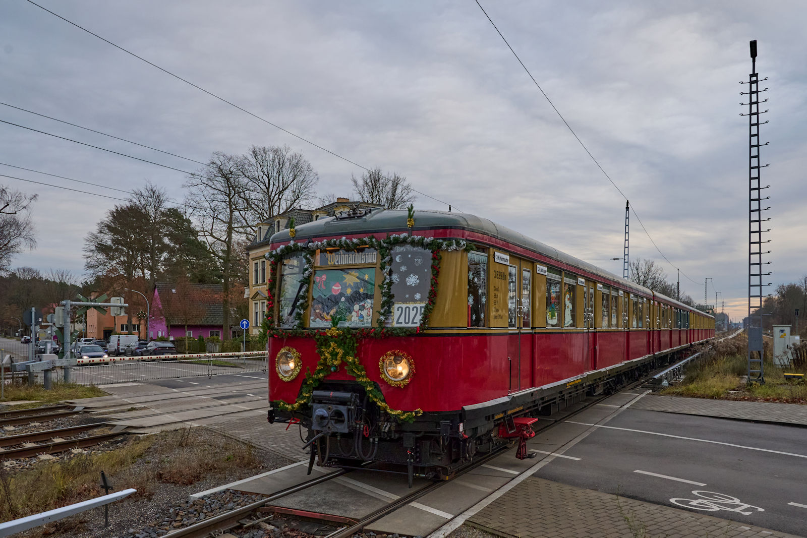 Weihnachtsfahrten des Historischen S-Bahn Berlin e. V. führten den historischen S-Bahn-Zug, bestehend aus dem Viertelzug 3839/6401 und dem Viertelzug 475 605/875 605, am 06.12.2025 nach Oranienburg. Kurz vor dem Haltepunkt Borgsdorf wird einer von wenigen Bahnübergänge im Berliner S-Bahn-Netz gekreuzt.