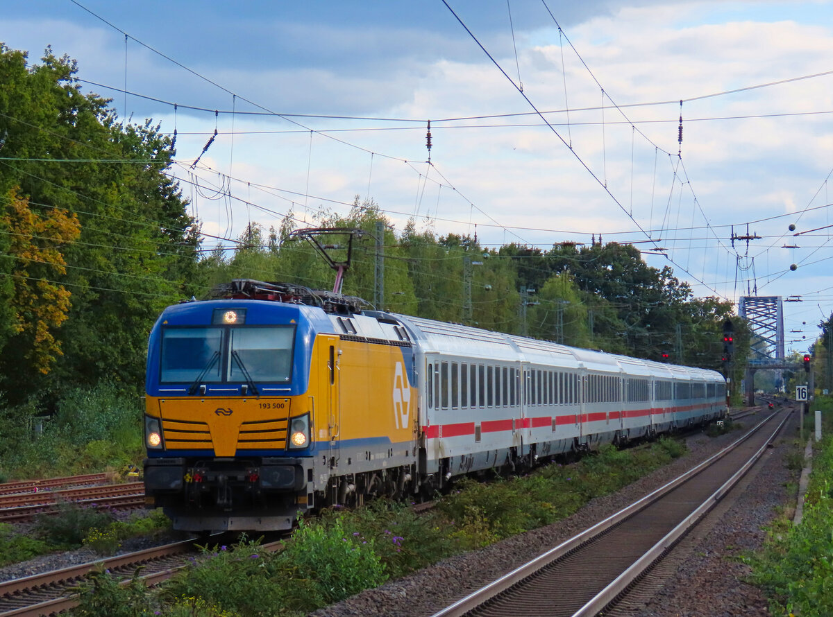 193 500 zieht den Leerpark vom IC Berlin-Münster-Berlin auf der Münsteraner Drehfahrt über Münster-Haltern-Recklinghausen-Dortmund-Hamm-Münster durch Münster Hiltrup zur Bereitstellung am Hauptbahnhof. Oktober 2024 Bern hard