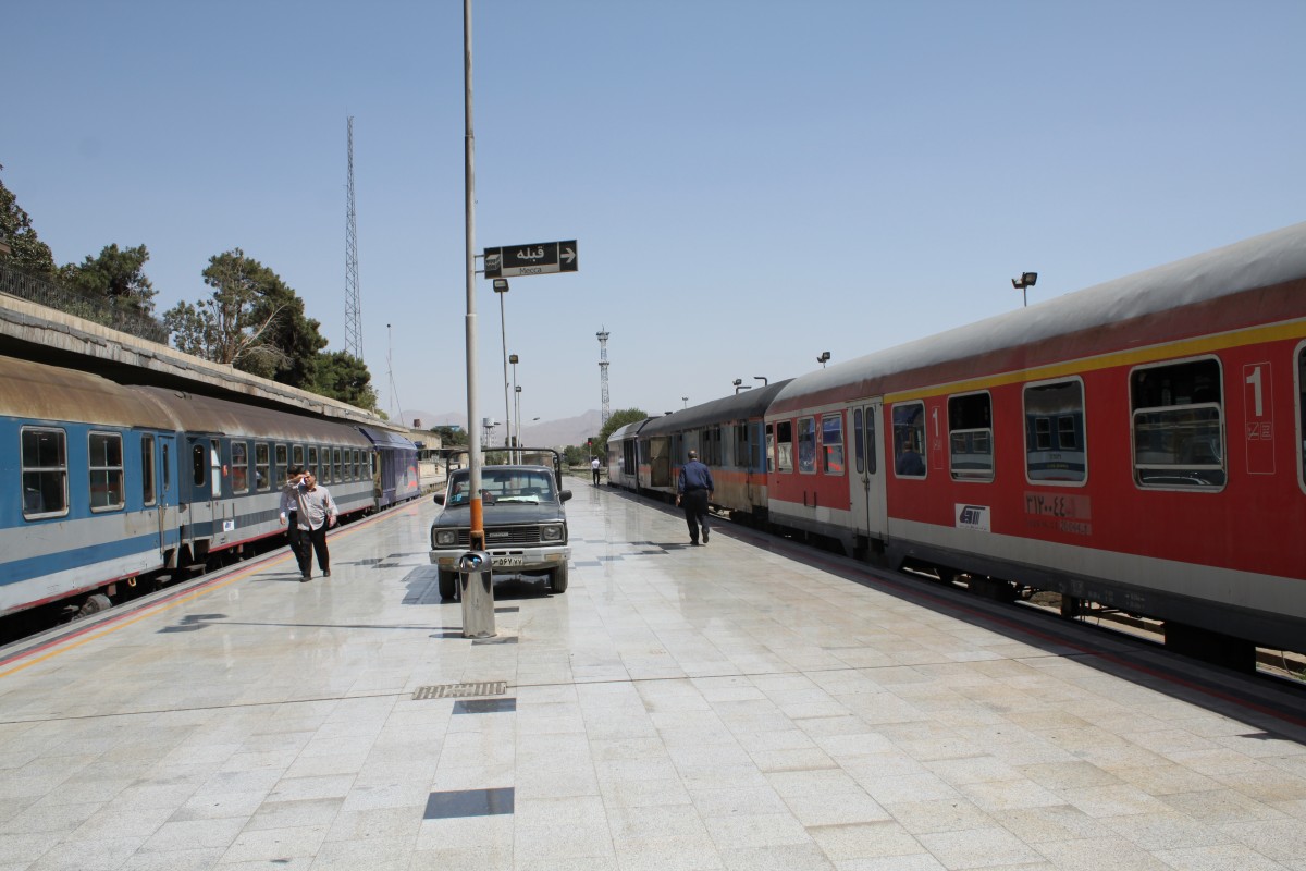 Zwei Züge im Bahnhof Teheran. Der rechte Zug mit dem Fahrziel Mashad besteht aus ex DB Regio-Waggons, die großteils noch in verkehrsrot lackiert sind.