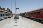 Zwei Züge im Bahnhof Teheran. Der rechte Zug mit dem Fahrziel Mashad besteht aus ex DB Regio-Waggons, die großteils noch in verkehrsrot lackiert sind. Sven M