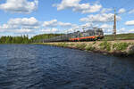 Bei Björnsjö überquert die Bahn auf einem Damm den See Björnsjön. Am Nachmittag fahren leider nur wenig Südfahrer über die Strecke. Trotzdem ist am 16.06.2022 der Hectorrail Zug 41243 unterwegs. Er transportiert frischs Papier der Firma SCA aus den Papierfabriken an der Küste in den Süden des Landes. Am Zug ist eine Doppeltraktion aus den Reihen 243 und 142 zu sehen. Die Loks der Reihe 142 sind ehemalige ÖBB-Loks der Reihe 1142. David Endlich