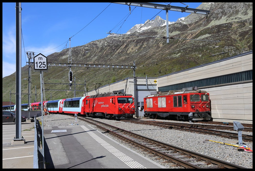 Der Glacier Express erreicht hier, aus Visp kommend, mit Zuglok 103 am 19.5.2025 um 10.48 Uhr den Bahnhof Andermatt. Rechts ist die Diesellok 61 der Matterhorn Gotthard Bahn vor dem Schuppen zu sehen.