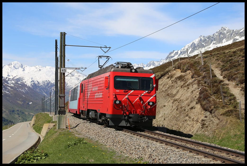 Lok 103 der Matterhorn Gotthard Bahn ist hier am 19.05.2025 um 11.26 Uhr, aus Andermatt kommend, auf halbem Weg mit dem Glacieer Express zum nächsten Haltepunkt Oberalppass unterwegs.