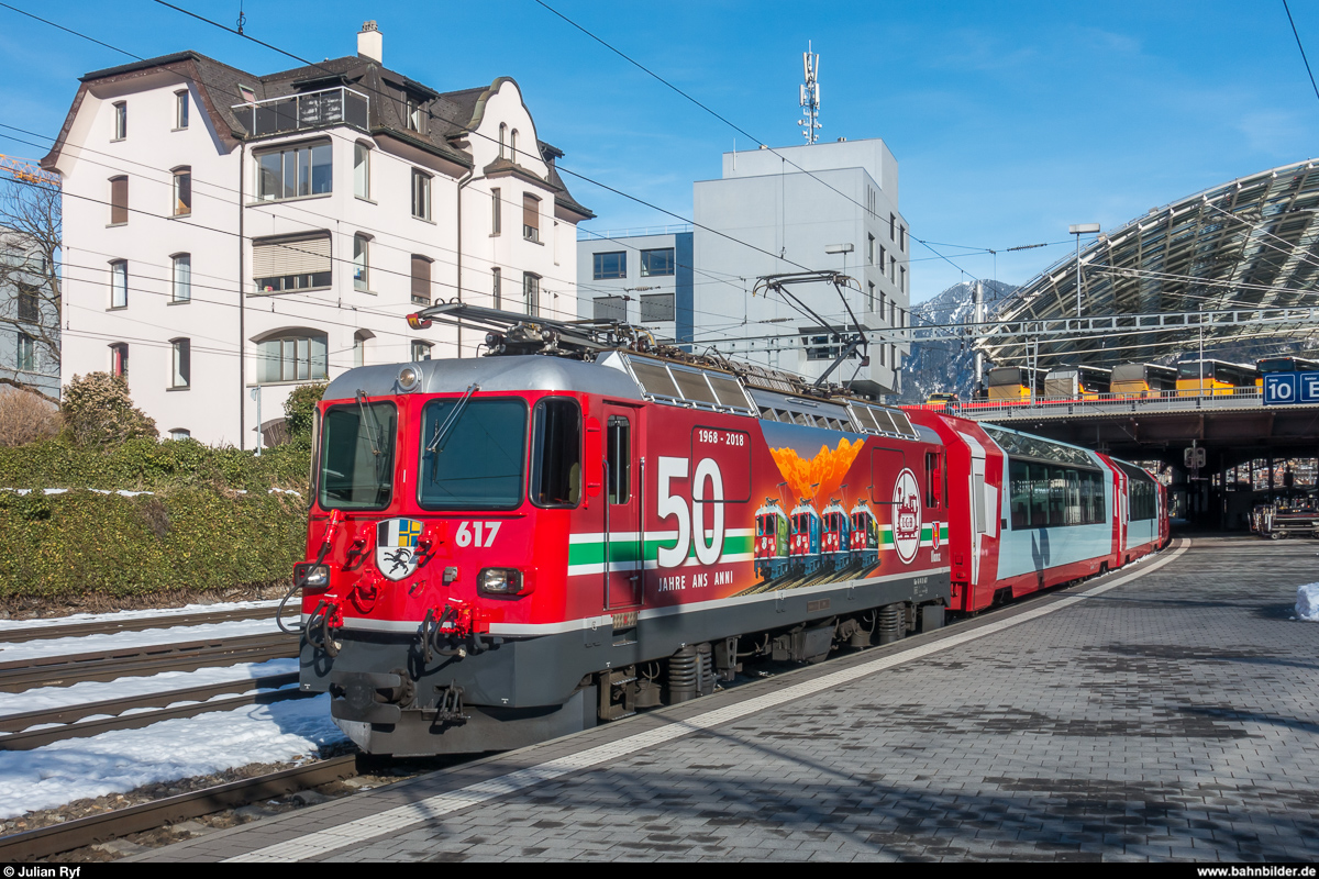 Aufgrund der lawinenbedingten Sperrung des Oberalppasses verkehrt der Glacier Express derzeit nur zwischen St. Moritz und Chur. Unter der Postautostation im Bahnhof Chur wartet am 24. Januar 2018 im schönsten Sonnenlicht die neu beklebte und jetzt für LGB werbende Ge 4/4 II 617 mit der Komposition auf die Rückfahrt ins Engadin.<br>