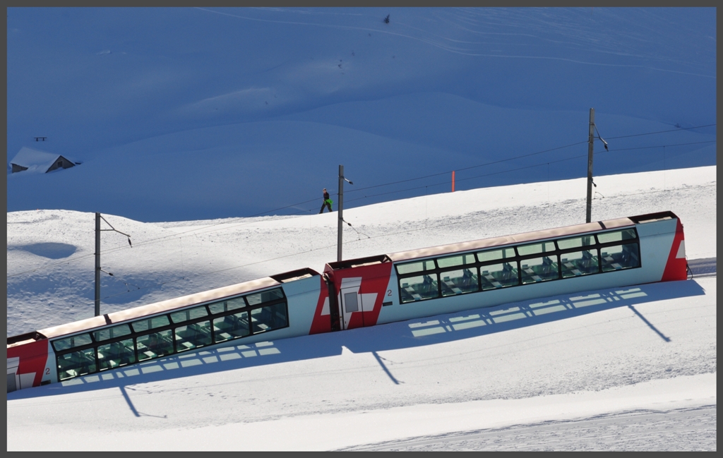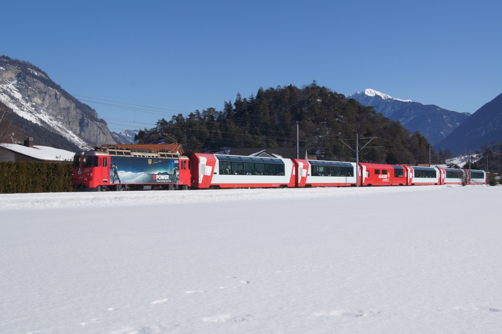 Nicht nur die Güterzüge sind lang auf der Oberländer Linie, sondern auch die doppelten GlacierExpress 906/908, womit hier nur der halbe Zug zu sehen ist.